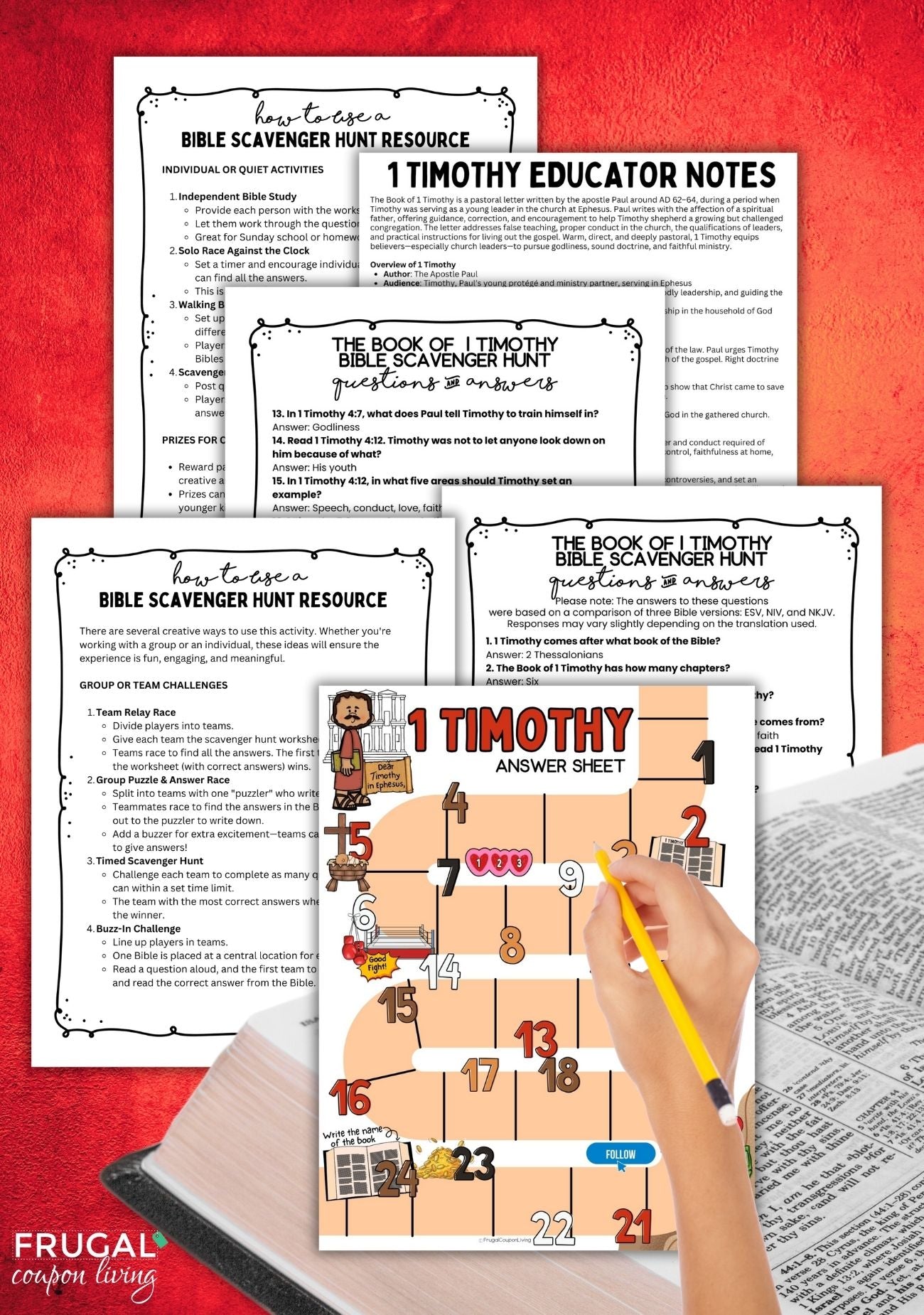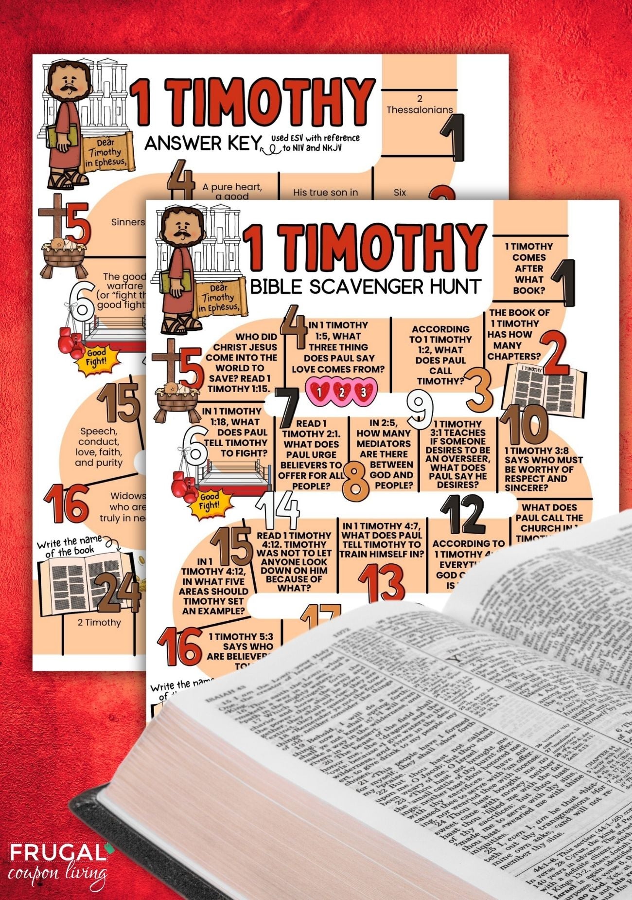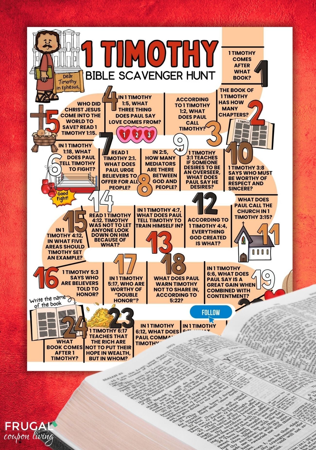 This Bible scavenger hunt focuses entirely on the Book of 1 Timothy and follows the chapters in biblical sequence.