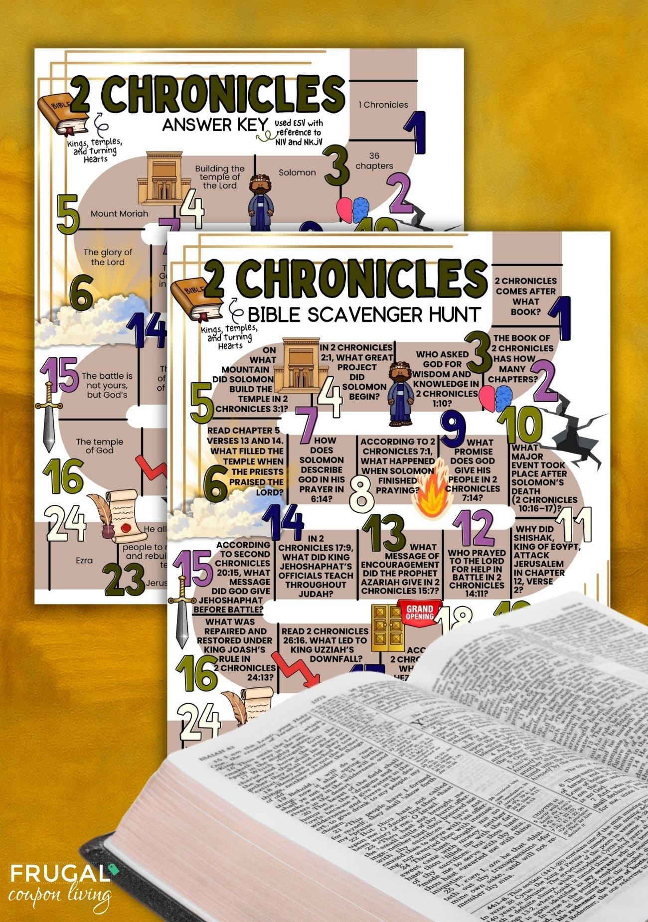 This Bible scavenger hunt focuses entirely on the Book of 2 Chronicles and follows the chapters in biblical sequence. Questions and answers are based on the ESV translation, with references to the NIV and NKJV for clarity.