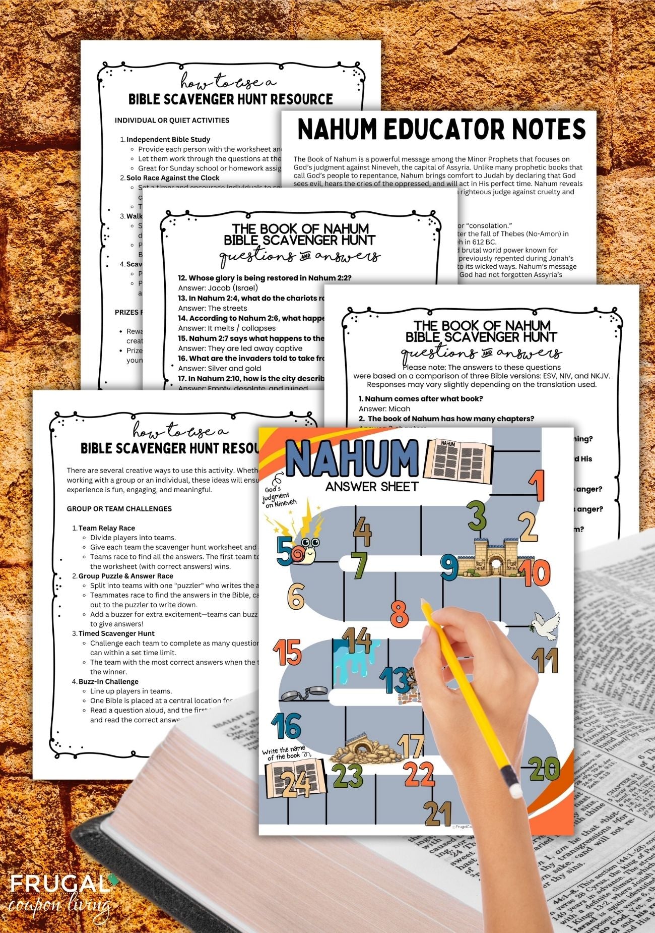 Bring your Bible study or Sunday school lesson to life with this Printable Nahum Bible Scavenger Hunt. This interactive activity guides older kids, teens, and adults through the Book of Nahum while helping them explore its powerful message about God’s justice, sovereignty, and protection of His people. With 24 Scripture-based trivia questions, this scavenger hunt is ideal for Sunday school, homeschooling, youth groups, or personal Bible study.