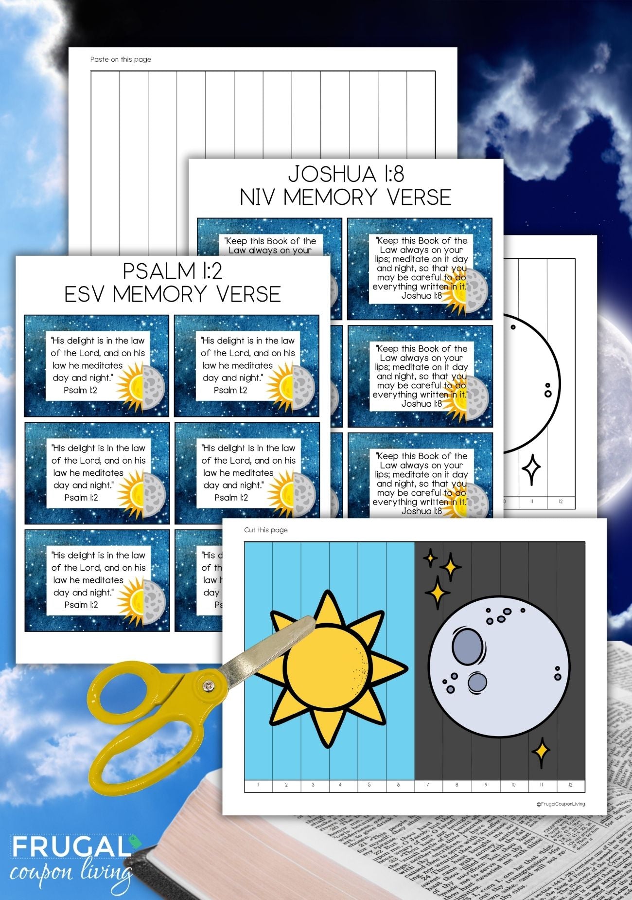 This printable Christian craft combines art, creativity, and Scripture to teach kids about faith and reflection. As children cut, glue, and fold their agamograph (also known as a folded picture craft or optical illusion art project), they’ll see two different images appear — the sun on one side and the moon on the other — illustrating Psalm 1:2 and Joshua 1:8.