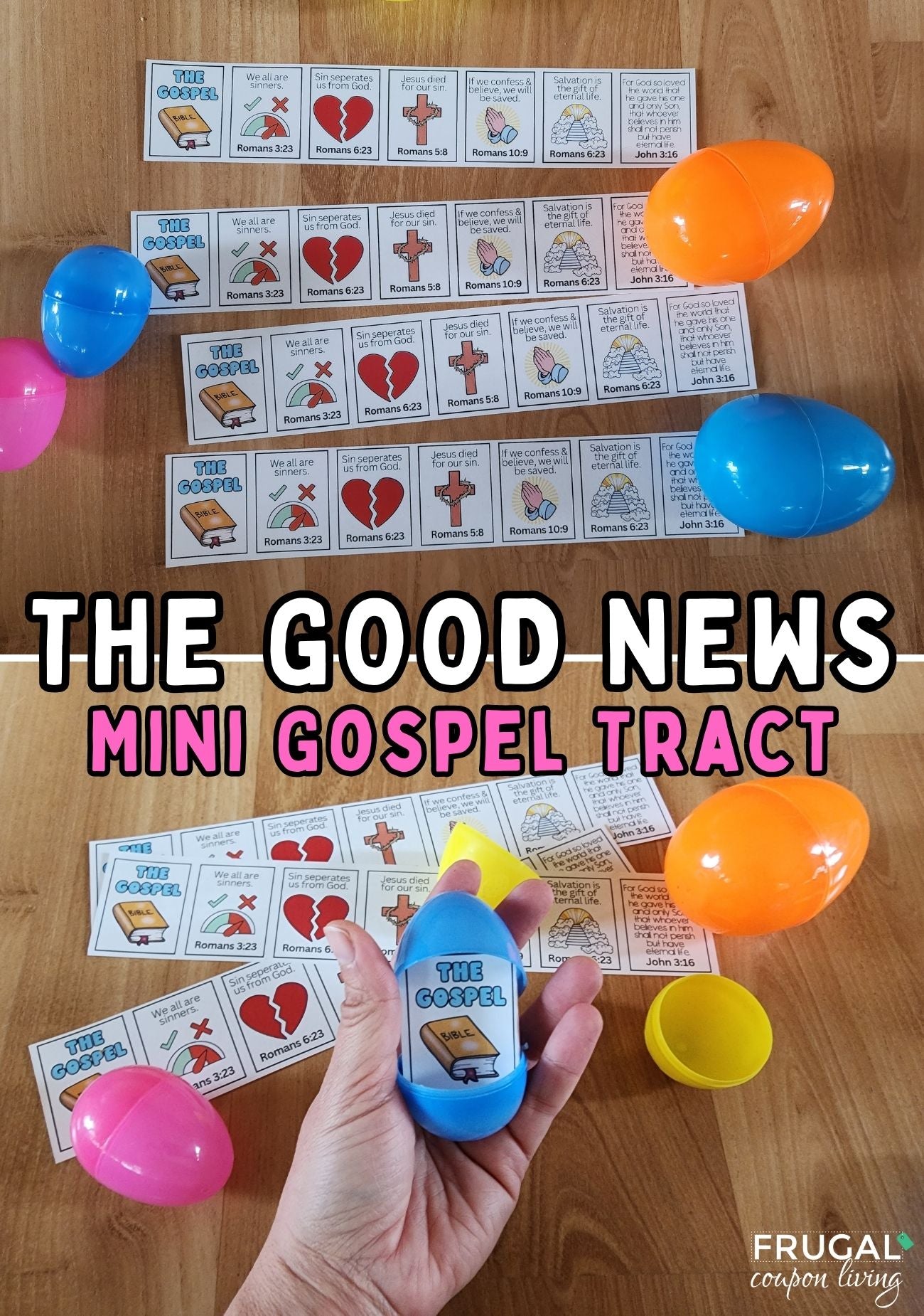 Each printable page includes four narrow gospel strips. Simply cut out each strip, fold it back and forth accordion-style, and place the finished mini book inside a plastic Easter egg to share the gospel during Easter celebrations.