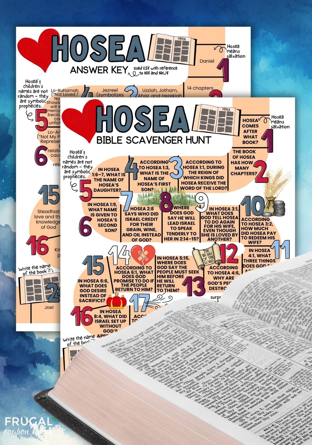Bring your Bible study or Sunday school lesson to life with this Printable Hosea Bible Scavenger Hunt. This interactive activity guides older kids, teens, and adults through the Book of Hosea while helping them explore its major themes, vivid imagery, and powerful message of God’s redeeming love. With 24 chapter-by-chapter trivia questions, this scavenger hunt is ideal for Sunday school, homeschooling, youth groups, or personal Bible study.