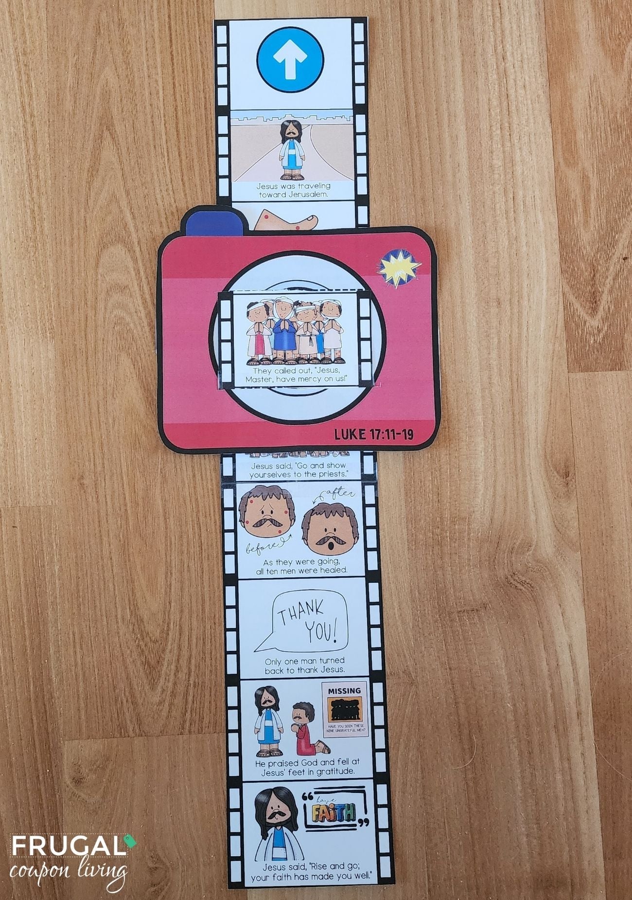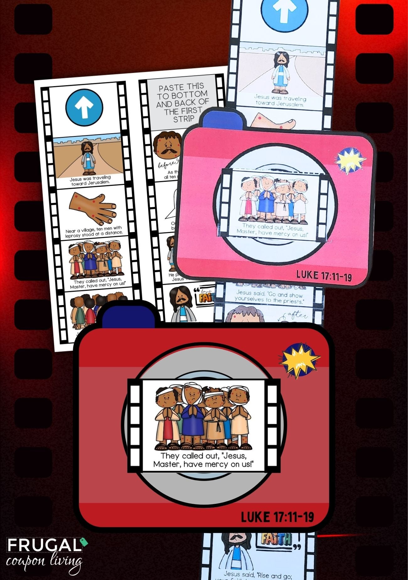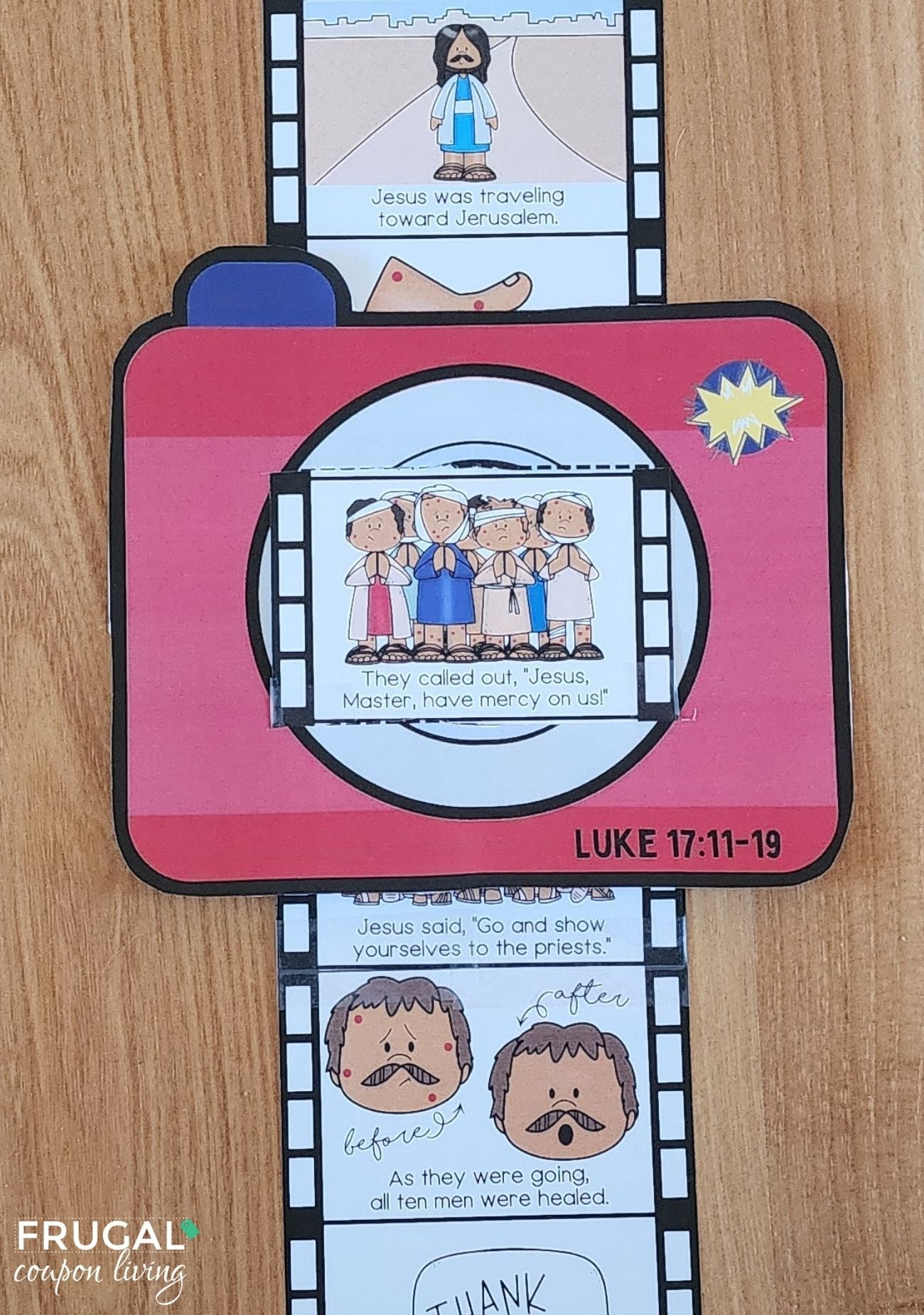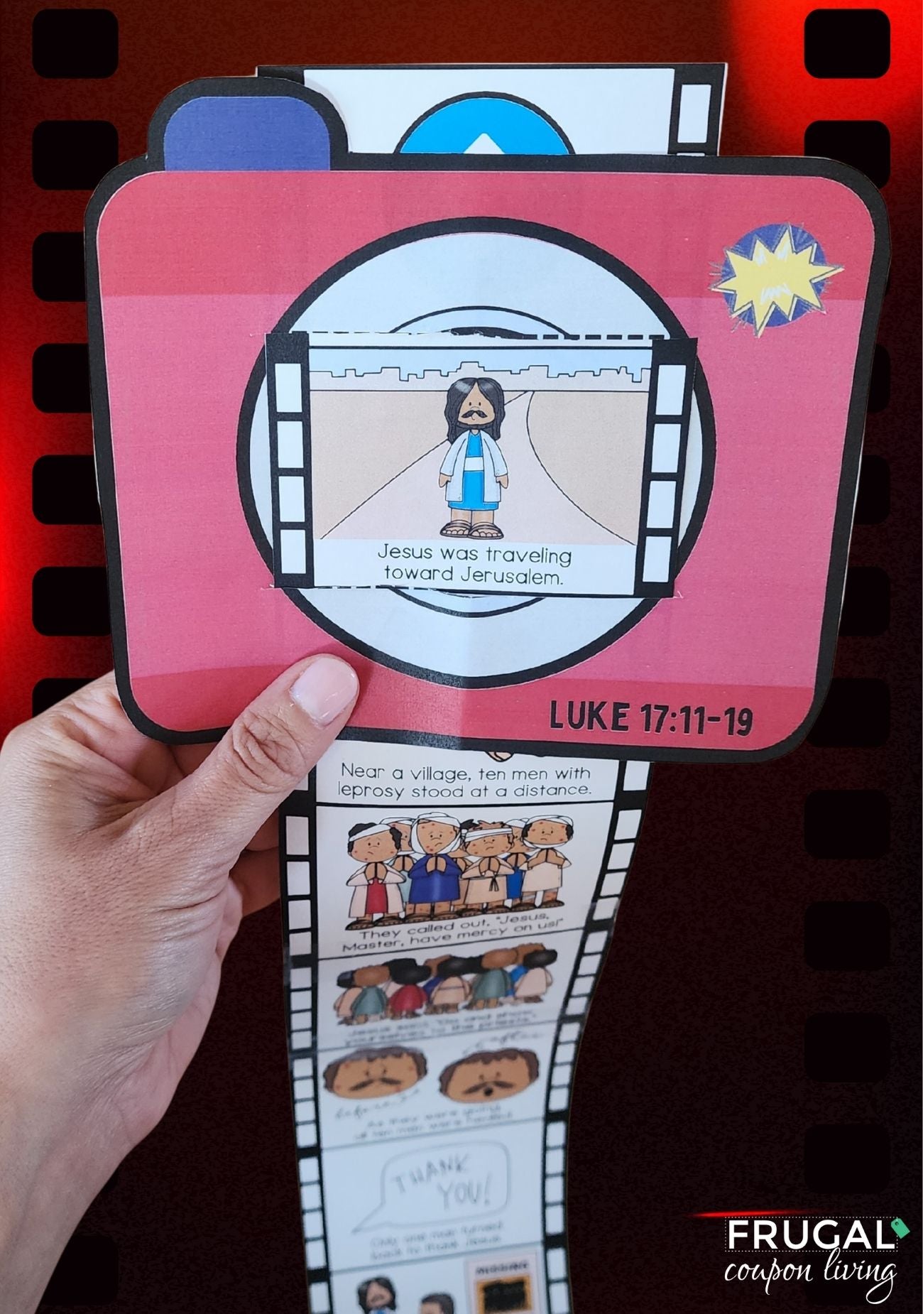 As children color, cut, and pull their paper film strip through the camera, they’ll watch the story unfold frame by frame—just like a real movie reel. This memorable Bible activity highlights the moment when all ten men were healed, but only one returned to thank Jesus, helping kids understand why gratitude matters to God.