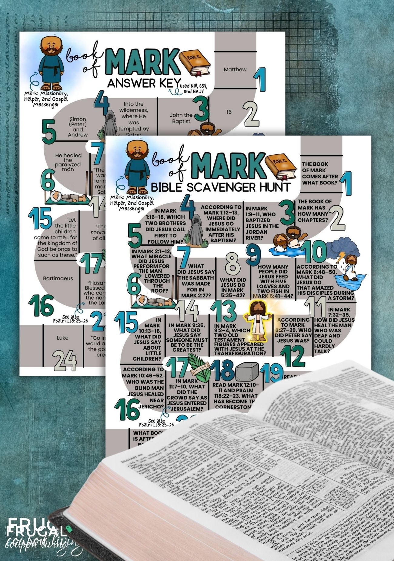This scavenger hunt focuses entirely on the Book of Mark and follows the chapters in sequence.