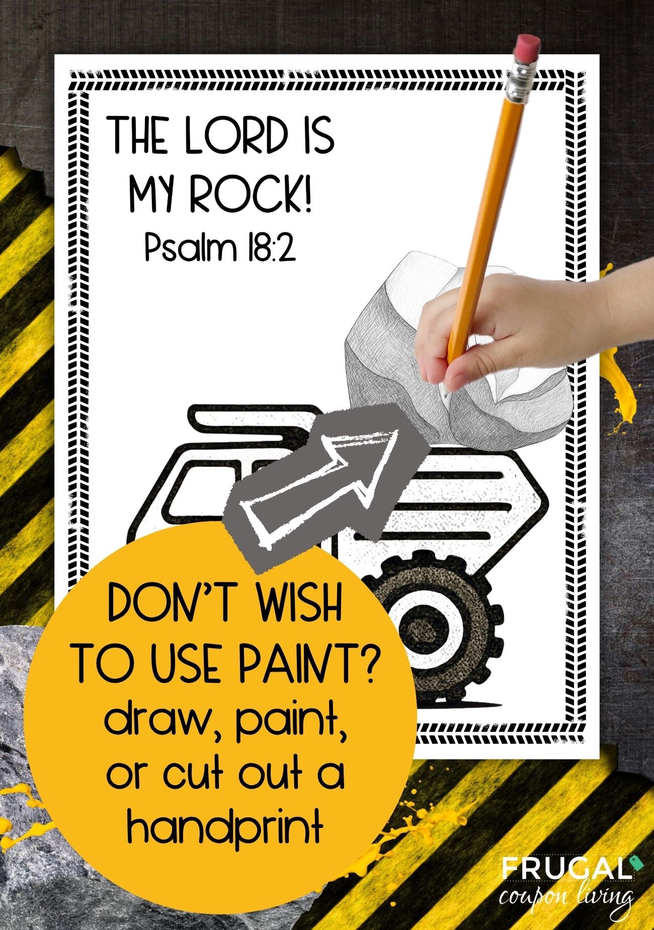 ▶︎ If you’d rather skip the paint, kids can use the black-and-white version to draw a rock in the truck’s bucket instead. Inside the rock, they can write or draw something that gives them strength—like prayer, family, or God’s Word.