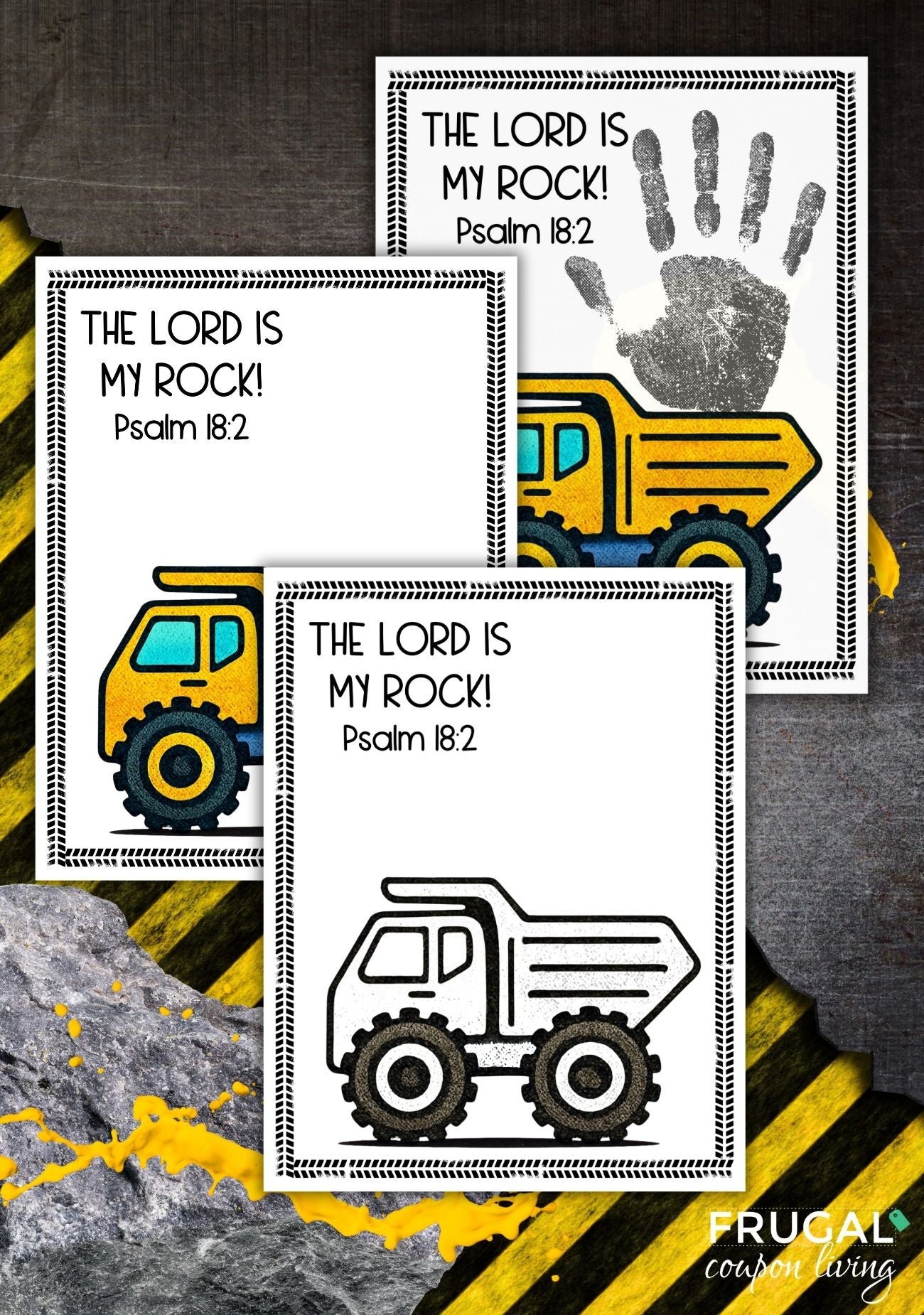▶︎ Features a fun dump truck design—kids add their gray handprint in the bucket to symbolize “The Lord is my rock”